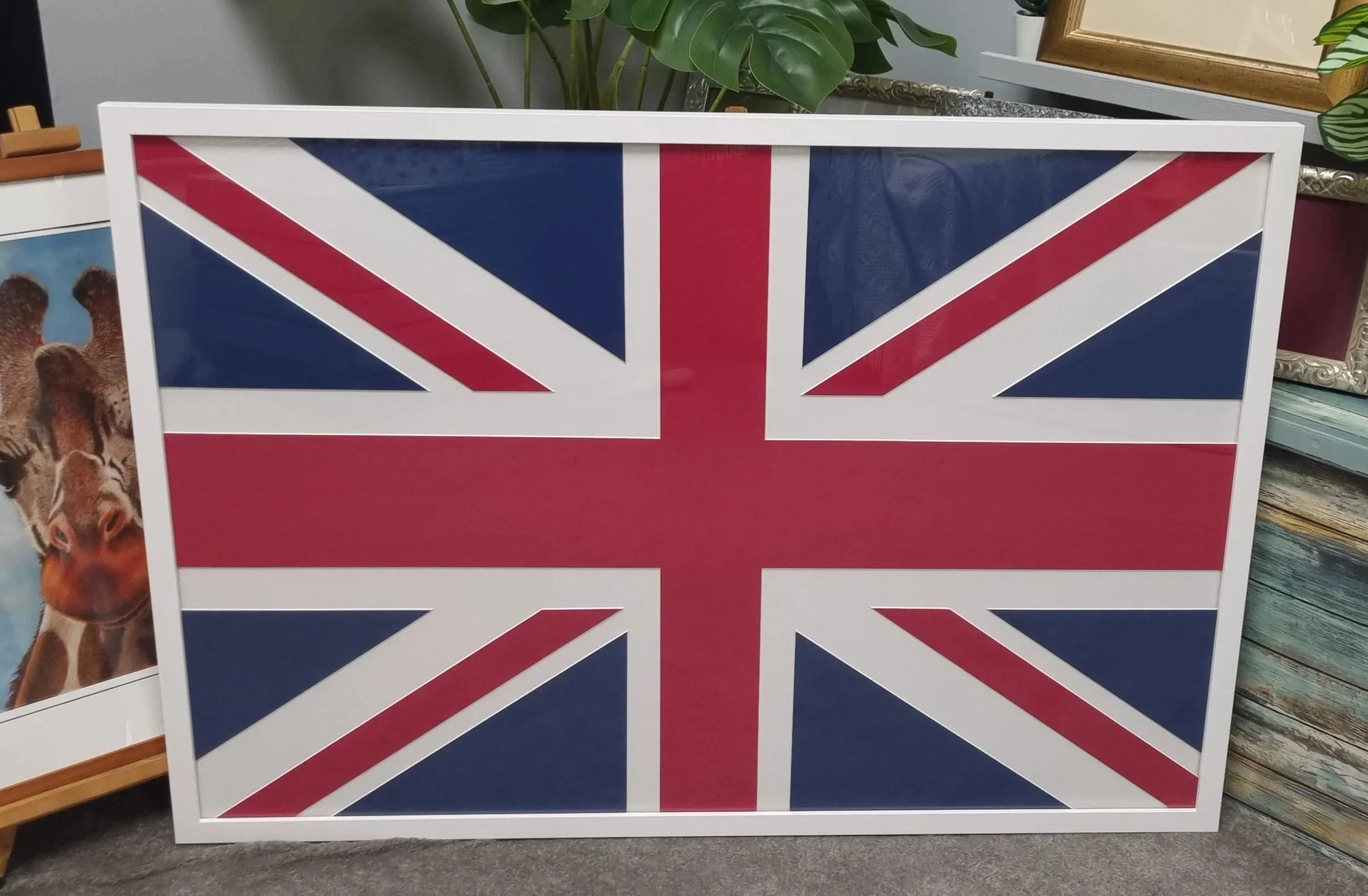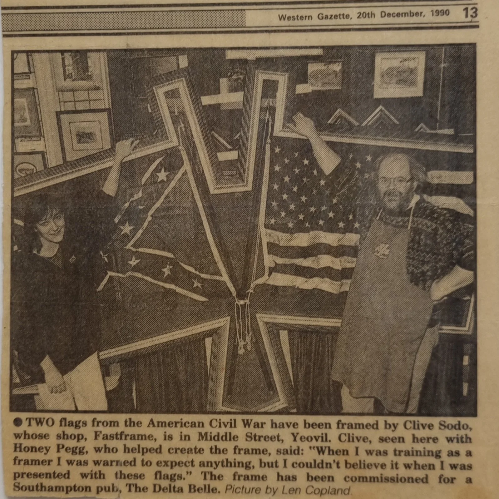 After I achieved my Master Framer Certification, I helped create this huge piece, with my then boss, Clive. The flags were brand new and one of my jobs was to trash them and make them look like they had been through the civil war, using curtain poles as the flag poles. It was put together in the shop only to find that it was too big to go through the back service entrance door, to the delivery van. We had to carry it through the front door and up Yeovil’s Middle Street.
