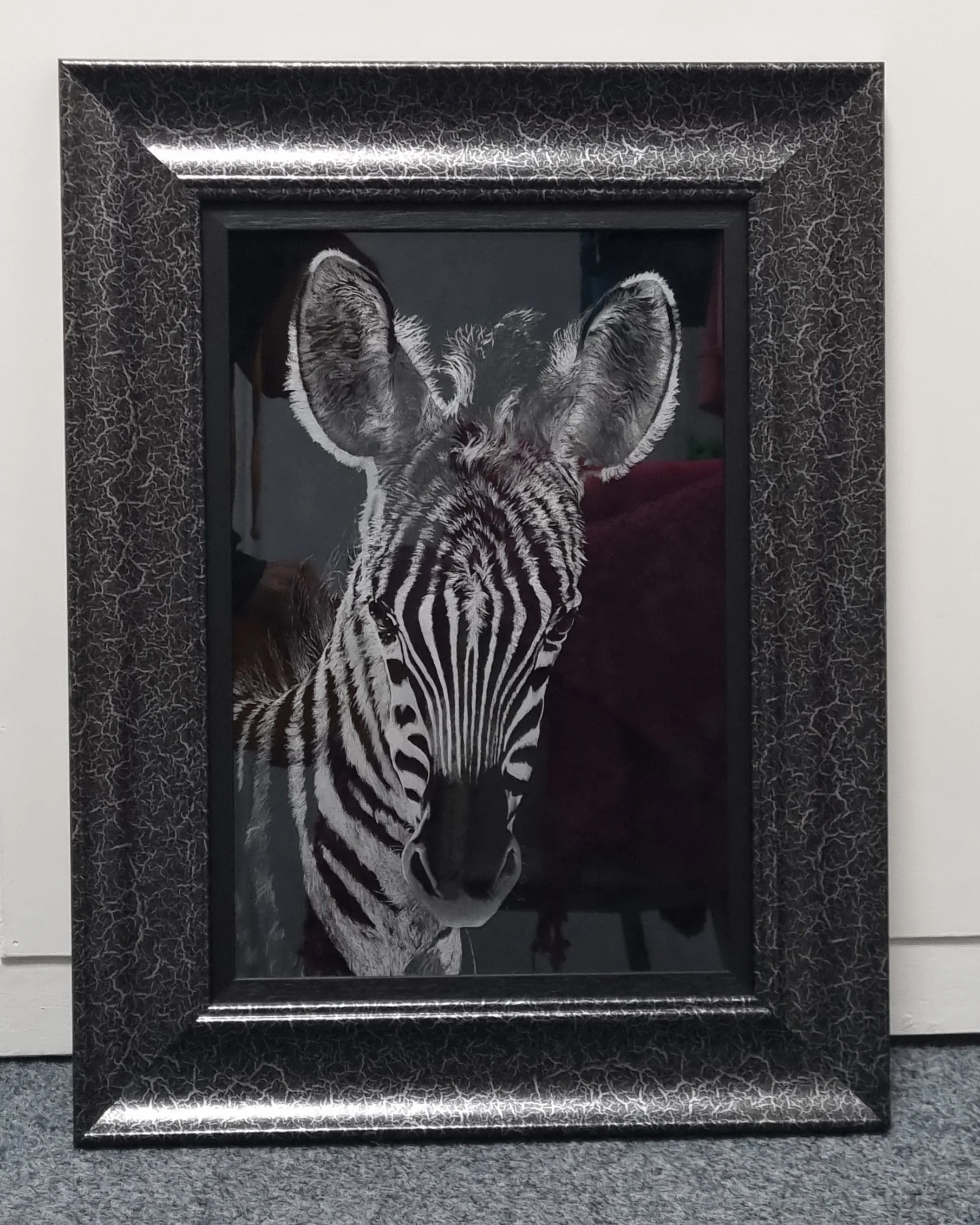 This zebra glass engraving was done using the Swiss diamond hand engraving technique instead of an electric engraver. This results in very fine detail being achieved. Framed in a slim black frame and a super chunky black and cracked silver frame on top makes this piece stand out.