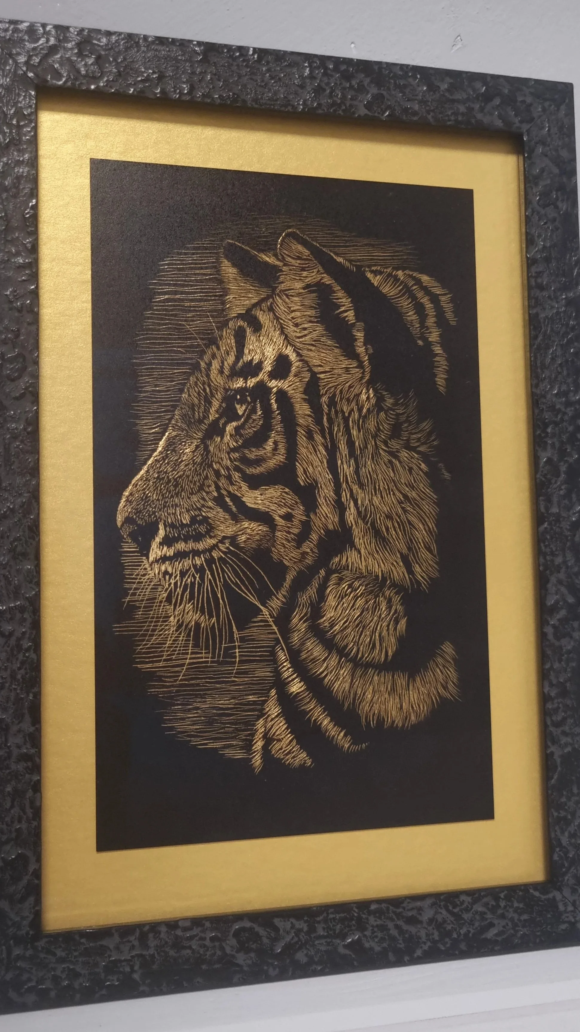 Scraper foil never gets old…not in my opinion anyway! This little tiger one framed in a gold mount with a textures black frame and invisible glass makes the gold pop.